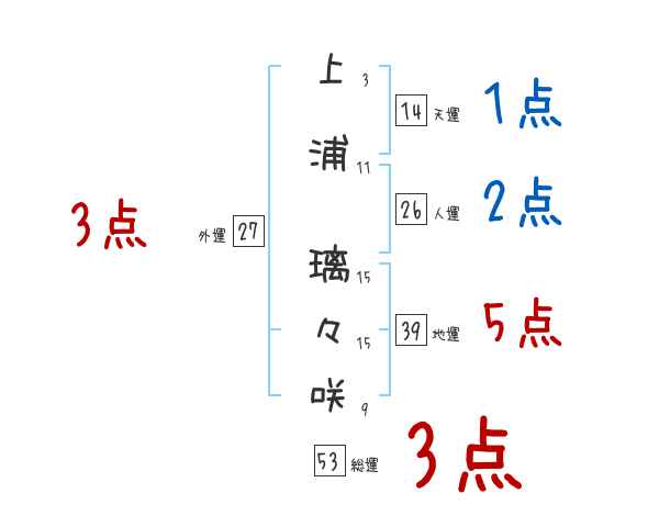 外運![]() | 上浦璃々咲さんの外運は27画の3つ星!頭脳明晰だが強情で摩擦が多い傾向。孤立に注意。 生活面を象徴する運勢です。外部から受ける影響力を表し、結婚運、家庭運や職場、環境への順応性を表します。 |