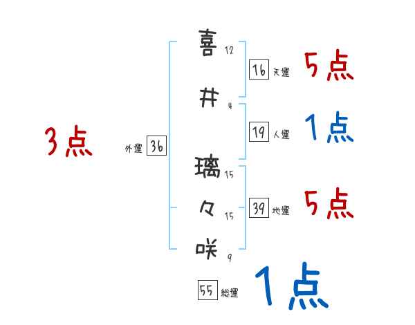 外運![]() | 喜井璃々咲さんの外運は36画の3つ星!先見性が豊かです。多少神経質で苦労することも。 生活面を象徴する運勢です。外部から受ける影響力を表し、結婚運、家庭運や職場、環境への順応性を表します。 |