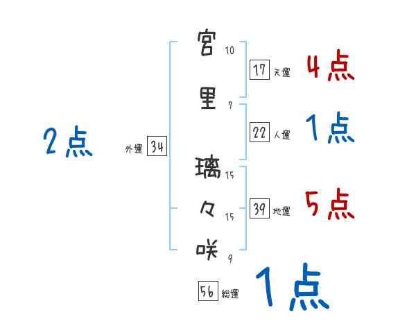 人運![]() | 宮里璃々咲さんの人運は22画の1つ星!努力することが苦手ないっぽう手先が器用。芸術性にも優れる。 性格や才能などを表す2番目に重要な運勢です。人間関係や協調性、社会的な成功に影響します。主に20歳から50歳ぐらいまでの中年期の運勢を表します。 |