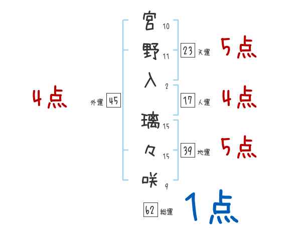外運![]() | 宮野入璃々咲さんの外運は45画の4つ星!もくもくと物事を進め達成する。地味な努力家。 生活面を象徴する運勢です。外部から受ける影響力を表し、結婚運、家庭運や職場、環境への順応性を表します。 |