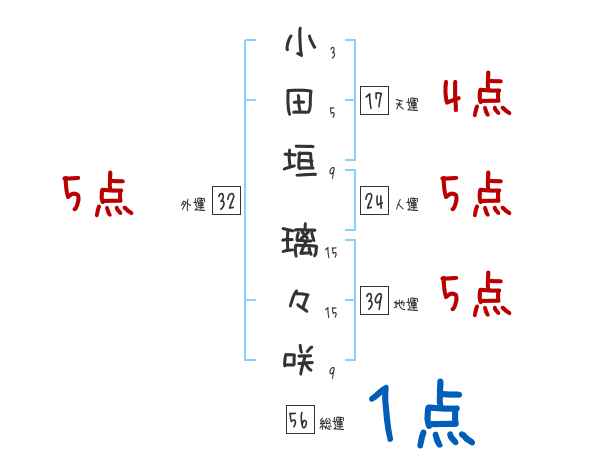 外運![]() | 小田垣璃々咲さんの外運は32画の5つ星!柔軟性があり成功する。チャンスが多く金運が良い。 生活面を象徴する運勢です。外部から受ける影響力を表し、結婚運、家庭運や職場、環境への順応性を表します。 |
