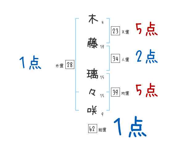 天運![]() | 木藤璃々咲さんの天運は23画の5つ星!想像力に優れ活力がある。一代で成功し名誉を手に入れる。 家系が持つ宿命的な運勢を表します。祖先から受け継いだ苗字ですので自分の力が及びません。家柄を象徴します。 |