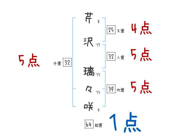 外運![]() | 芹沢璃々咲さんの外運は32画の5つ星!柔軟性があり成功する。チャンスが多く金運が良い。 生活面を象徴する運勢です。外部から受ける影響力を表し、結婚運、家庭運や職場、環境への順応性を表します。 |