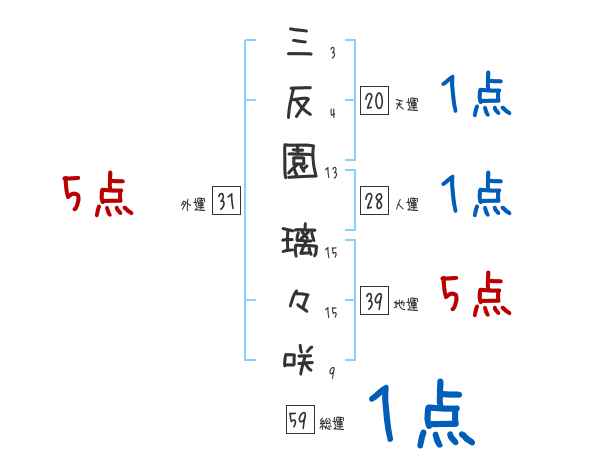 総運![]() | 三反園璃々咲さんの総運は59画の1つ星!意志の弱さであきらめることが多いかも。粘り強さが必要。 あなたの人生を表す1番重要な運勢です。生涯を通じて影響する総合運となり、主に50歳以降の晩年期に影響を及ぼします。 |