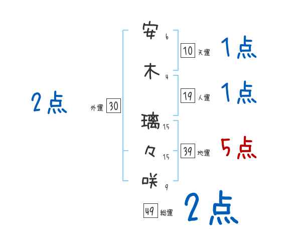 総運![]() | 安木璃々咲さんの総運は49画の2つ星!不安定な性格で明暗がある人生。周りの人には支援されやすい。 あなたの人生を表す1番重要な運勢です。生涯を通じて影響する総合運となり、主に50歳以降の晩年期に影響を及ぼします。 |