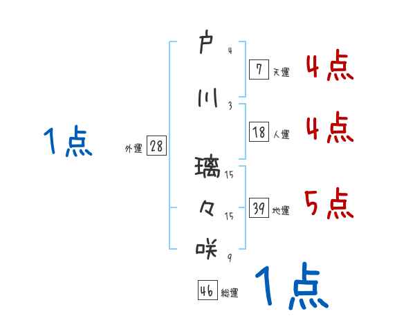 | 天運  | 戸川璃々咲さんの天運は7画の4つ星!強い意志や信念を持ち独立心が強い。自立する。家系が持つ宿命的な運勢を表します。祖先から受け継いだ苗字ですので自分の力が及びません。家柄を象徴します。 |