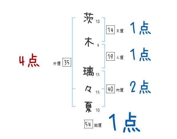 天運![]() | 茨木璃々夏さんの天運は14画の1つ星!人に対して優しいがストレスを溜め込みがち。人間関係のトラブルを避けるよう気をつけましょう。 家系が持つ宿命的な運勢を表します。祖先から受け継いだ苗字ですので自分の力が及びません。家柄を象徴します。 |