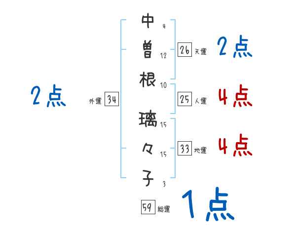 外運![]() | 中曽根璃々子さんの外運は34画の2つ星!独創性に優れるが、自尊心が強く災難に注意しましょう。 生活面を象徴する運勢です。外部から受ける影響力を表し、結婚運、家庭運や職場、環境への順応性を表します。 |