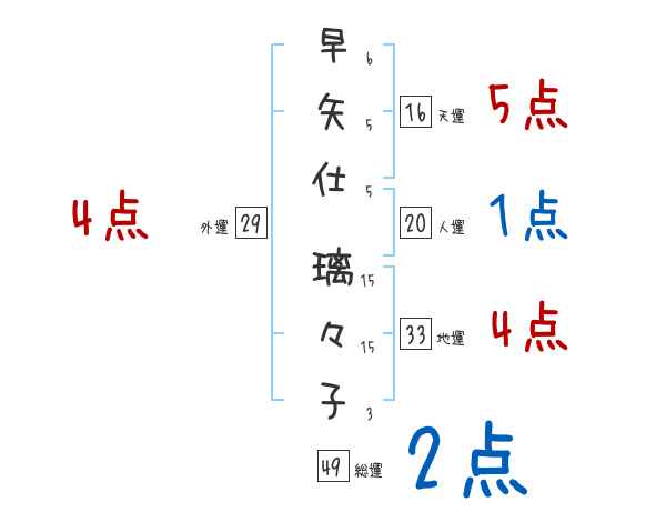 天運![]() | 早矢仕璃々子さんの天運は16画の5つ星!人望が厚く大きく発展する。逆転成功が見える。 家系が持つ宿命的な運勢を表します。祖先から受け継いだ苗字ですので自分の力が及びません。家柄を象徴します。 |