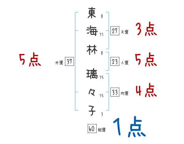 総運![]() | 東海林璃々子さんの総運は60画の1つ星!悲観的で迷いやすい。波乱が多く損をしないように。 あなたの人生を表す1番重要な運勢です。生涯を通じて影響する総合運となり、主に50歳以降の晩年期に影響を及ぼします。 |