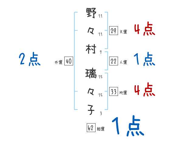 天運![]() | 野々村璃々子さんの天運は29画の4つ星!完全主義で才能がある。厳格な心の持ち主。 家系が持つ宿命的な運勢を表します。祖先から受け継いだ苗字ですので自分の力が及びません。家柄を象徴します。 |