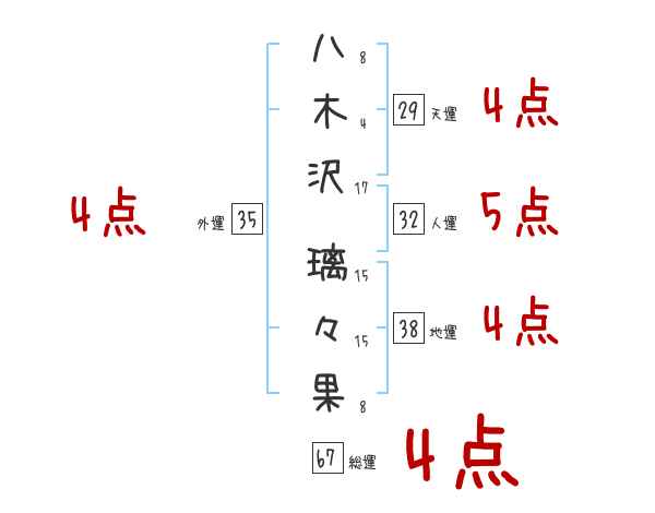 外運![]() | 八木沢璃々果さんの外運は35画の4つ星!温厚な性格で感受性が高い。穏和な性格で人望が厚い。 生活面を象徴する運勢です。外部から受ける影響力を表し、結婚運、家庭運や職場、環境への順応性を表します。 |