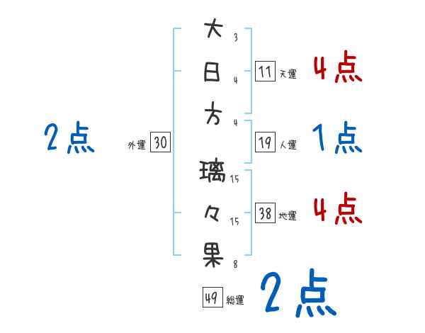 天運![]() | 大日方璃々果さんの天運は11画の4つ星!着実に富や地位を得る幸運な人生。 家系が持つ宿命的な運勢を表します。祖先から受け継いだ苗字ですので自分の力が及びません。家柄を象徴します。 |
