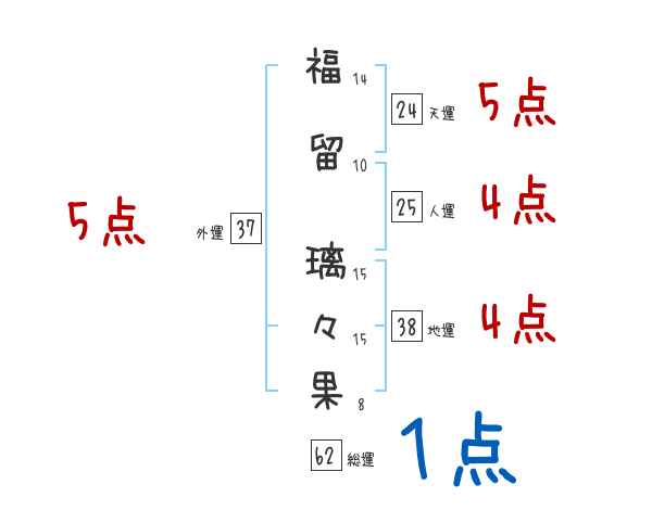 総運![]() | 福留璃々果さんの総運は62画の1つ星!困難なトラブルが多く精神的に疲労しないように気をつけましょう。 あなたの人生を表す1番重要な運勢です。生涯を通じて影響する総合運となり、主に50歳以降の晩年期に影響を及ぼします。 |