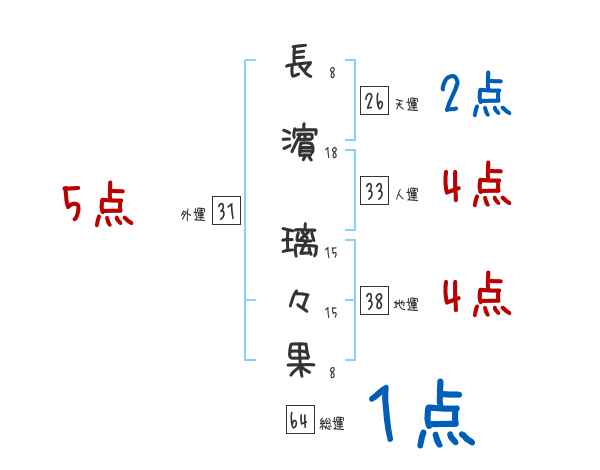 天運![]() | 長濵璃々果さんの天運は26画の2つ星!波瀾万丈かも。信頼できる人を大事にしましょう。 家系が持つ宿命的な運勢を表します。祖先から受け継いだ苗字ですので自分の力が及びません。家柄を象徴します。 |
