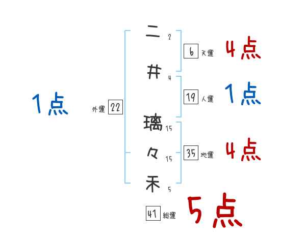 天運![]() | 二井璃々禾さんの天運は6画の4つ星!慎重な努力家で信頼を得る。誠実な精神で向上心に優れる。 家系が持つ宿命的な運勢を表します。祖先から受け継いだ苗字ですので自分の力が及びません。家柄を象徴します。 |