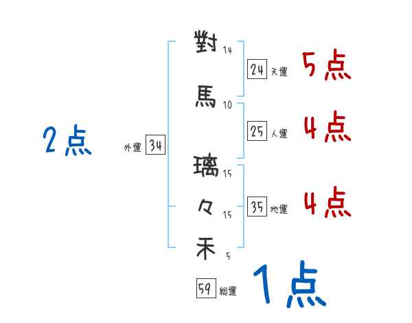 天運![]()  | 對馬璃々禾さんの天運は24画の5つ星!家庭運が良く順調な人生。金運にも恵まれる。 家系が持つ宿命的な運勢を表します。祖先から受け継いだ苗字ですので自分の力が及びません。家柄を象徴します。 |