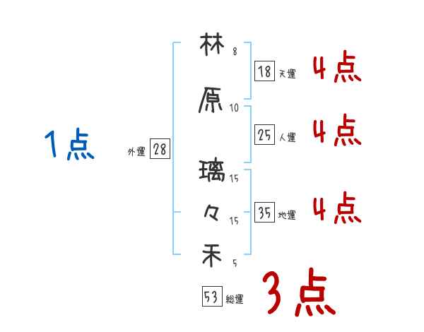天運![]() | 林原璃々禾さんの天運は18画の4つ星!情熱的で剛気。忍耐力があり信頼される。 家系が持つ宿命的な運勢を表します。祖先から受け継いだ苗字ですので自分の力が及びません。家柄を象徴します。 |