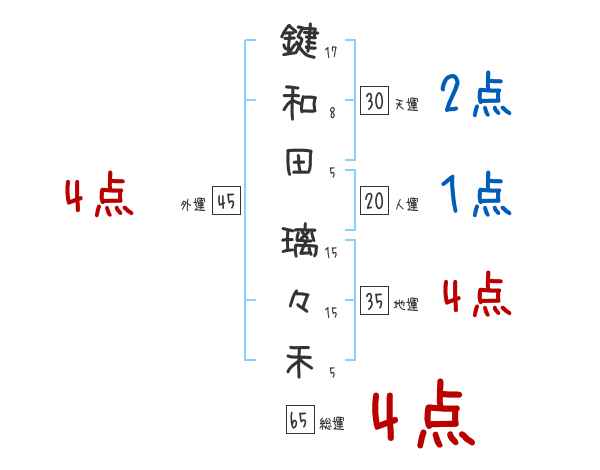 総運![]() | 鍵和田璃々禾さんの総運は65画の4つ星!幸運に恵まれ繁栄する。包容力がある。 あなたの人生を表す1番重要な運勢です。生涯を通じて影響する総合運となり、主に50歳以降の晩年期に影響を及ぼします。 |