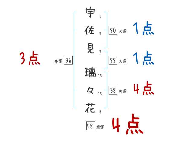 外運![]() | 宇佐見璃々花さんの外運は36画の3つ星!先見性が豊かです。多少神経質で苦労することも。 生活面を象徴する運勢です。外部から受ける影響力を表し、結婚運、家庭運や職場、環境への順応性を表します。 |