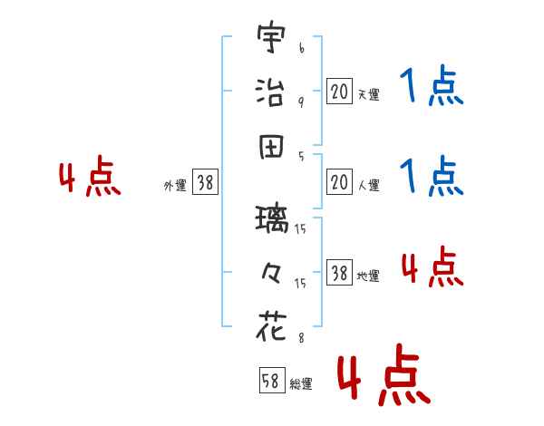 総運![]() | 宇治田璃々花さんの総運は58画の4つ星!安定した生活。大器晩成タイプ。 あなたの人生を表す1番重要な運勢です。生涯を通じて影響する総合運となり、主に50歳以降の晩年期に影響を及ぼします。 |