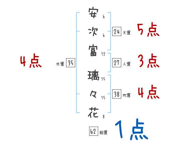 天運![]() | 安次富璃々花さんの天運は24画の5つ星!家庭運が良く順調な人生。金運にも恵まれる。 家系が持つ宿命的な運勢を表します。祖先から受け継いだ苗字ですので自分の力が及びません。家柄を象徴します。 |