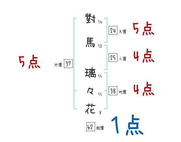 天運![]() | 對馬璃々花さんの天運は24画の5つ星!家庭運が良く順調な人生。金運にも恵まれる。 家系が持つ宿命的な運勢を表します。祖先から受け継いだ苗字ですので自分の力が及びません。家柄を象徴します。 |