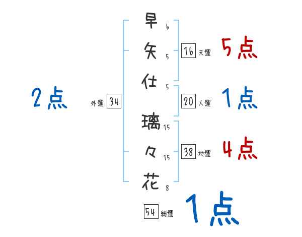 天運![]() | 早矢仕璃々花さんの天運は16画の5つ星!人望が厚く大きく発展する。逆転成功が見える。 家系が持つ宿命的な運勢を表します。祖先から受け継いだ苗字ですので自分の力が及びません。家柄を象徴します。 |