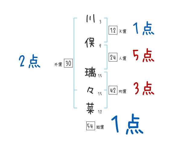 総運![]() | 川俣璃々菜さんの総運は54画の1つ星!トラブルが多いかも。周りをよく見て協調して過ごしましょう。 あなたの人生を表す1番重要な運勢です。生涯を通じて影響する総合運となり、主に50歳以降の晩年期に影響を及ぼします。 |