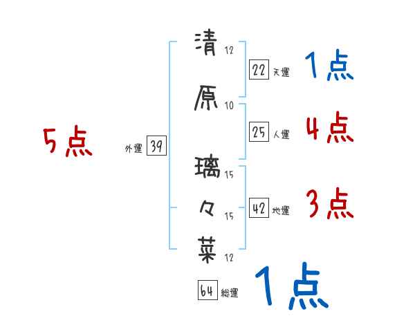 天運![]() | 清原璃々菜さんの天運は22画の1つ星!努力することが苦手ないっぽう手先が器用。芸術性にも優れる。 家系が持つ宿命的な運勢を表します。祖先から受け継いだ苗字ですので自分の力が及びません。家柄を象徴します。 |