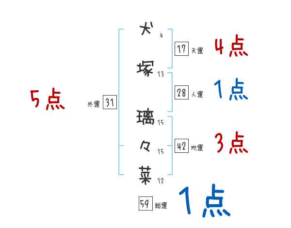 | 総運  | 犬塚璃々菜さんの総運は59画の1つ星!意志の弱さであきらめることが多いかも。粘り強さが必要。あなたの人生を表す1番重要な運勢です。生涯を通じて影響する総合運となり、主に50歳以降の晩年期に影響を及ぼします。 |