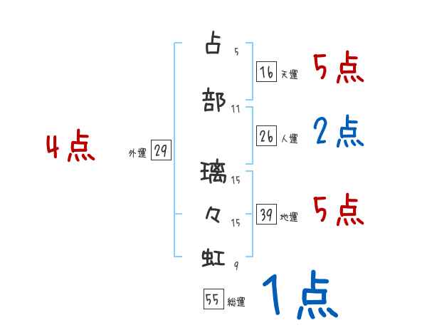 天運![]() | 占部璃々虹さんの天運は16画の5つ星!人望が厚く大きく発展する。逆転成功が見える。 家系が持つ宿命的な運勢を表します。祖先から受け継いだ苗字ですので自分の力が及びません。家柄を象徴します。 |