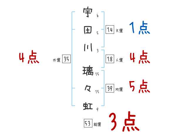 天運![]() | 宇田川璃々虹さんの天運は14画の1つ星!人に対して優しいがストレスを溜め込みがち。人間関係のトラブルを避けるよう気をつけましょう。 家系が持つ宿命的な運勢を表します。祖先から受け継いだ苗字ですので自分の力が及びません。家柄を象徴します。 |