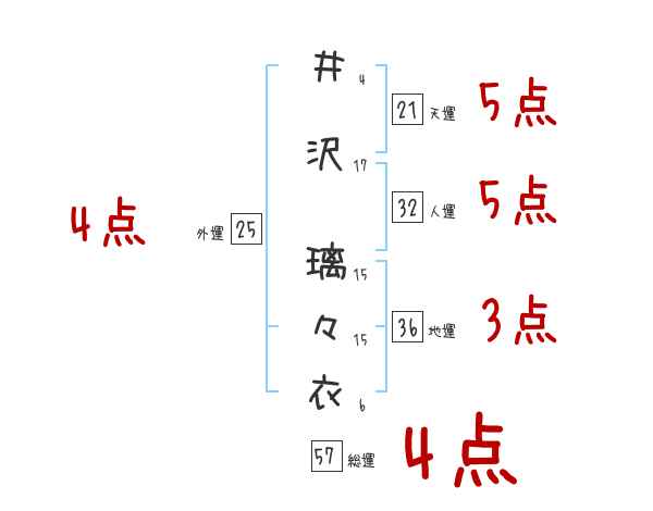 天運![]() | 井沢璃々衣さんの天運は21画の5つ星!統率力がある。独立し成功する。名誉を手に入れる。 家系が持つ宿命的な運勢を表します。祖先から受け継いだ苗字ですので自分の力が及びません。家柄を象徴します。 |