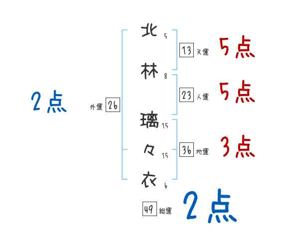 天運![]() | 北林璃々衣さんの天運は13画の5つ星!才能に恵まれ人気がある。名声を手に入れる。円満な人生。 家系が持つ宿命的な運勢を表します。祖先から受け継いだ苗字ですので自分の力が及びません。家柄を象徴します。 |