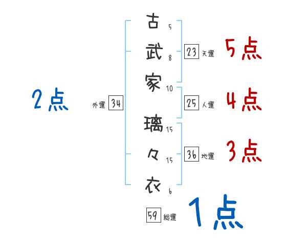 天運![]() | 古武家璃々衣さんの天運は23画の5つ星!想像力に優れ活力がある。一代で成功し名誉を手に入れる。 家系が持つ宿命的な運勢を表します。祖先から受け継いだ苗字ですので自分の力が及びません。家柄を象徴します。 |