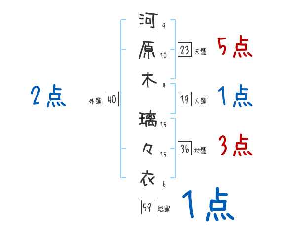 天運![]() | 河原木璃々衣さんの天運は23画の5つ星!想像力に優れ活力がある。一代で成功し名誉を手に入れる。 家系が持つ宿命的な運勢を表します。祖先から受け継いだ苗字ですので自分の力が及びません。家柄を象徴します。 |