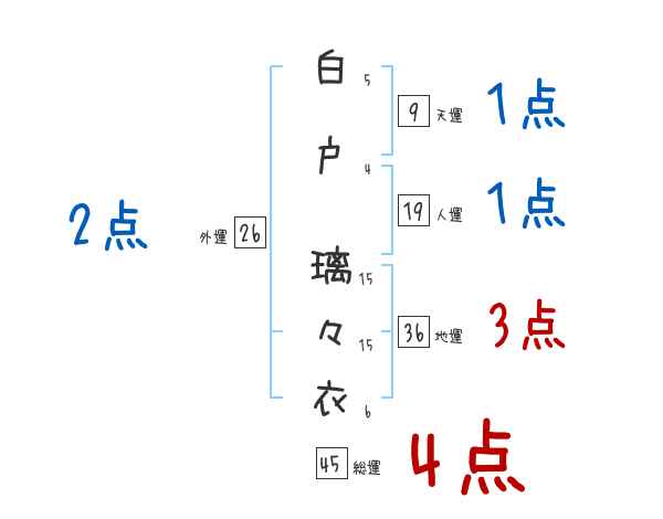 外運![]() | 白戸璃々衣さんの外運は26画の2つ星!波瀾万丈かも。信頼できる人を大事にしましょう。 生活面を象徴する運勢です。外部から受ける影響力を表し、結婚運、家庭運や職場、環境への順応性を表します。 |