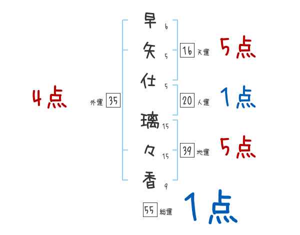 外運![]() | 早矢仕璃々香さんの外運は35画の4つ星!温厚な性格で感受性が高い。穏和な性格で人望が厚い。 生活面を象徴する運勢です。外部から受ける影響力を表し、結婚運、家庭運や職場、環境への順応性を表します。 |