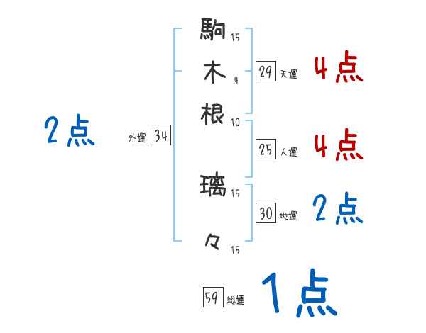 天運![]() | 駒木根璃々さんの天運は29画の4つ星!完全主義で才能がある。厳格な心の持ち主。 家系が持つ宿命的な運勢を表します。祖先から受け継いだ苗字ですので自分の力が及びません。家柄を象徴します。 |