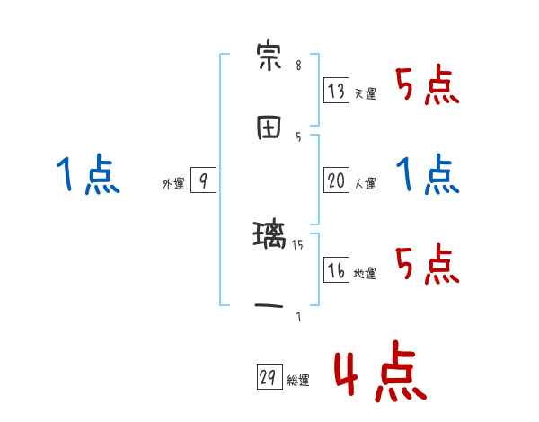 外運![]() | 宗田璃一さんの外運は9画の1つ星!消極的で才能を発揮することが苦手なことも。周りの意見に耳を傾けましょう。 生活面を象徴する運勢です。外部から受ける影響力を表し、結婚運、家庭運や職場、環境への順応性を表します。 |