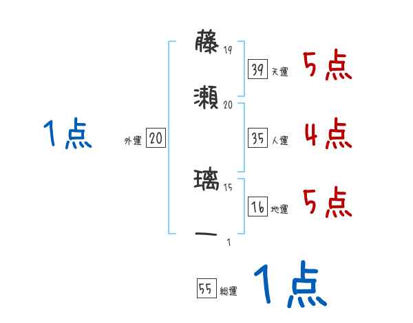 天運![]() | 藤瀬璃一さんの天運は39画の5つ星!社交性に優れ人望が厚い。人の上に立ち成功する。 家系が持つ宿命的な運勢を表します。祖先から受け継いだ苗字ですので自分の力が及びません。家柄を象徴します。 |