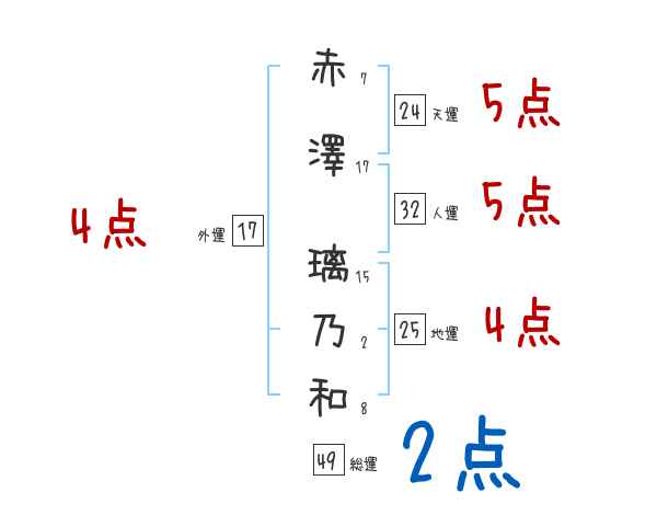 天運![]() | 赤澤璃乃和さんの天運は24画の5つ星!家庭運が良く順調な人生。金運にも恵まれる。 家系が持つ宿命的な運勢を表します。祖先から受け継いだ苗字ですので自分の力が及びません。家柄を象徴します。 |