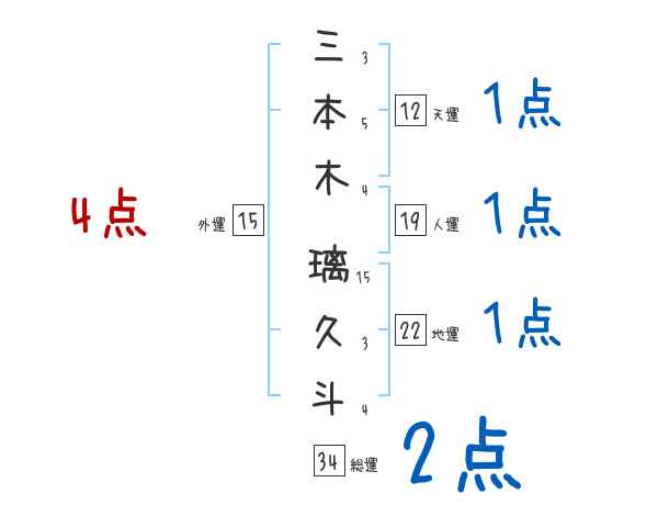 総運![]() | 三本木璃久斗さんの総運は34画の2つ星!独創性に優れるが、自尊心が強く災難に注意しましょう。 あなたの人生を表す1番重要な運勢です。生涯を通じて影響する総合運となり、主に50歳以降の晩年期に影響を及ぼします。 |