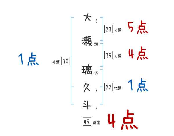 天運![]() | 大瀬璃久斗さんの天運は23画の5つ星!想像力に優れ活力がある。一代で成功し名誉を手に入れる。 家系が持つ宿命的な運勢を表します。祖先から受け継いだ苗字ですので自分の力が及びません。家柄を象徴します。 |