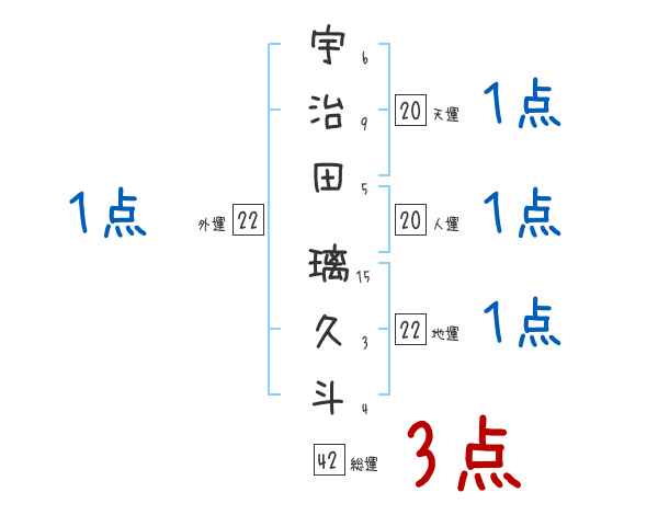 外運![]() | 宇治田璃久斗さんの外運は22画の1つ星!努力することが苦手ないっぽう手先が器用。芸術性にも優れる。 生活面を象徴する運勢です。外部から受ける影響力を表し、結婚運、家庭運や職場、環境への順応性を表します。 |