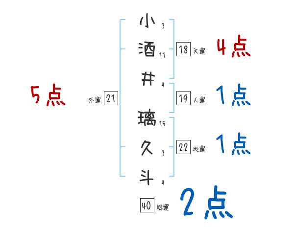 外運![]() | 小酒井璃久斗さんの外運は21画の5つ星!統率力がある。独立し成功する。名誉を手に入れる。 生活面を象徴する運勢です。外部から受ける影響力を表し、結婚運、家庭運や職場、環境への順応性を表します。 |