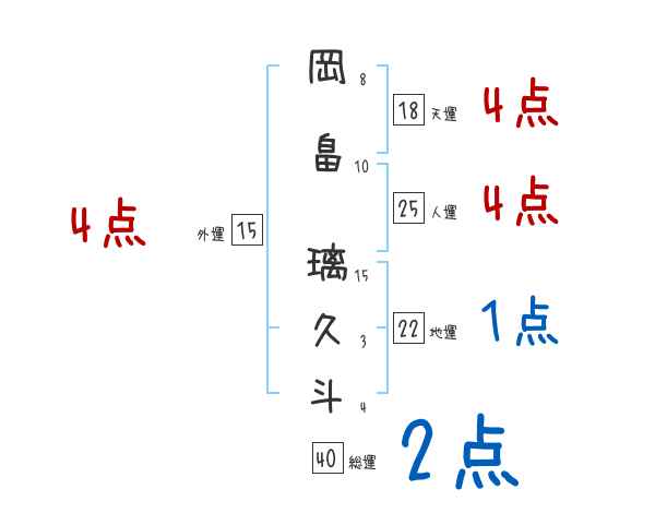 天運![]() | 岡畠璃久斗さんの天運は18画の4つ星!情熱的で剛気。忍耐力があり信頼される。 家系が持つ宿命的な運勢を表します。祖先から受け継いだ苗字ですので自分の力が及びません。家柄を象徴します。 |