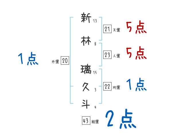 天運![]() | 新林璃久斗さんの天運は21画の5つ星!統率力がある。独立し成功する。名誉を手に入れる。 家系が持つ宿命的な運勢を表します。祖先から受け継いだ苗字ですので自分の力が及びません。家柄を象徴します。 |