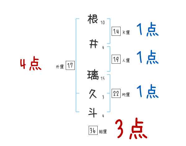 総運![]() | 根井璃久斗さんの総運は36画の3つ星!先見性が豊かです。多少神経質で苦労することも。 あなたの人生を表す1番重要な運勢です。生涯を通じて影響する総合運となり、主に50歳以降の晩年期に影響を及ぼします。 |